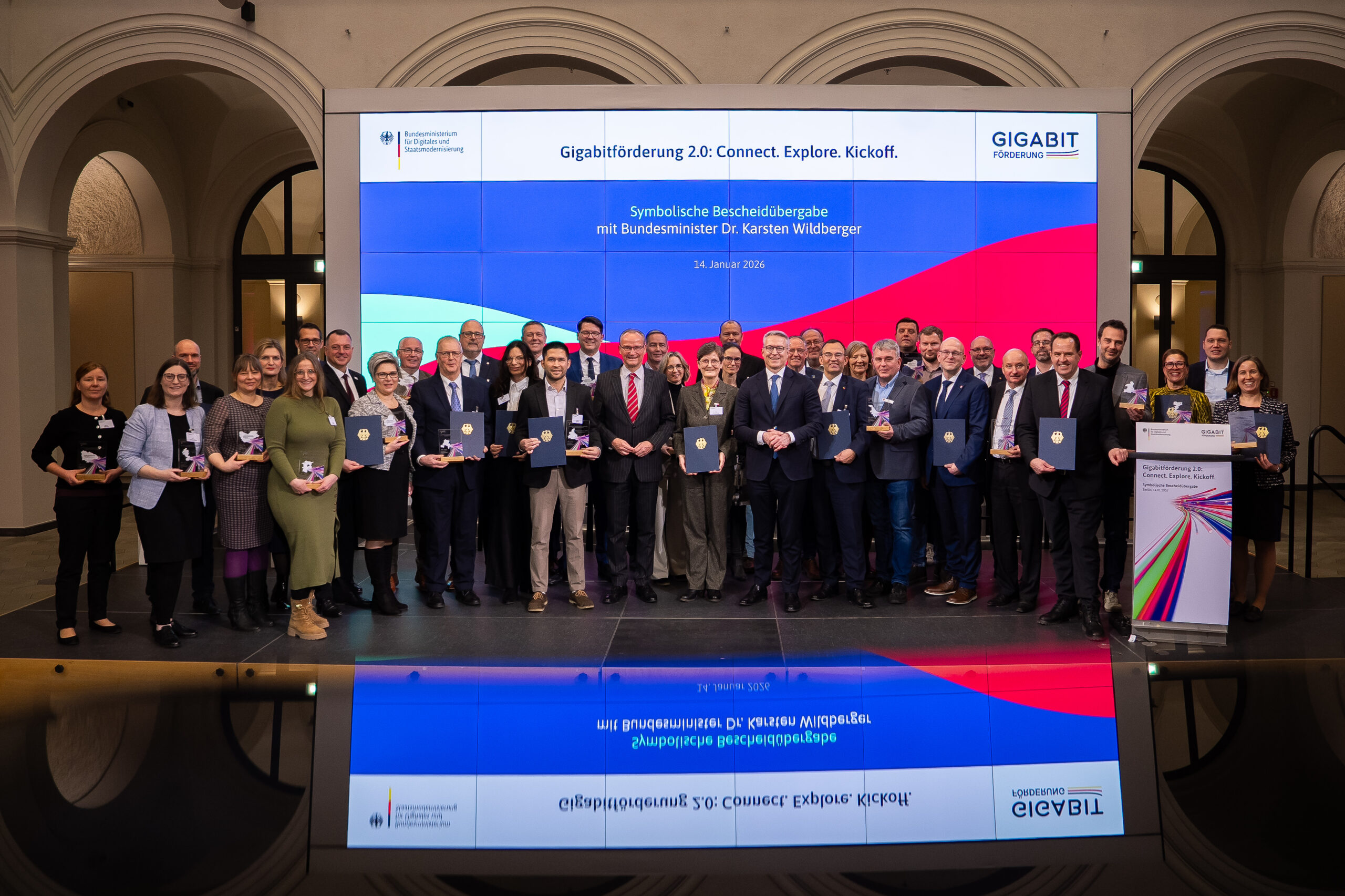 Weiter von der Landeshauptstadt Stuttgart nach Berlin, wo einen Tag später, am 14. Januar 2026, die symbolischen Förderurkunden im Rahmen der Gigabitförderung 2.0 an Kommunen aus ganz Deutschland übergeben wurden. Bei der feierlichen Veranstaltung würdigte Bundesminister für Digitales und Staatsmodernisierung Dr. Karsten Wildberger zahlreiche ausgewählte Projekte – darunter das Breitbandprojekt mit den fünf Reutlinger Gemeinden, für das Andreas Seifert, Geschäftsführer der OEW Breitband GmbH, eine Fördersumme von rund 15,5 Millionen Euro entgegennahm.